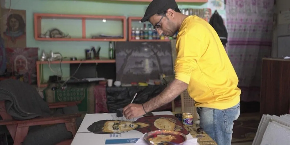 او جعبههای مقوایی دورریختهشدهی برنامه جهانی غذا (WFP) را جمع آوری کرده و آنها را به بوم نقاشی تبدیل کرده است.