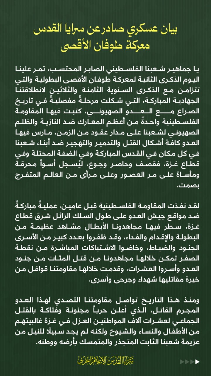 بیانیهٔ نظامی صادر شده از سوی سرایا القدس