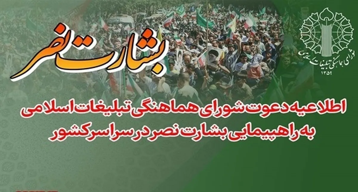 شورای هماهنگی تبلیغات اسلامی، ضمن گرامیداشت پایداری ملت قهرمان غزه، از عموم مردم مؤمن و آگاه ایران اسلامی در تمامی استانها دعوت مینماید تا در راهپیمایی سراسری «بشارت نصر»، پس از اقامه نماز عبادیـسیاسی جمعه ۱۸ مهرماه ۱۴۰۴، حضور یابند.