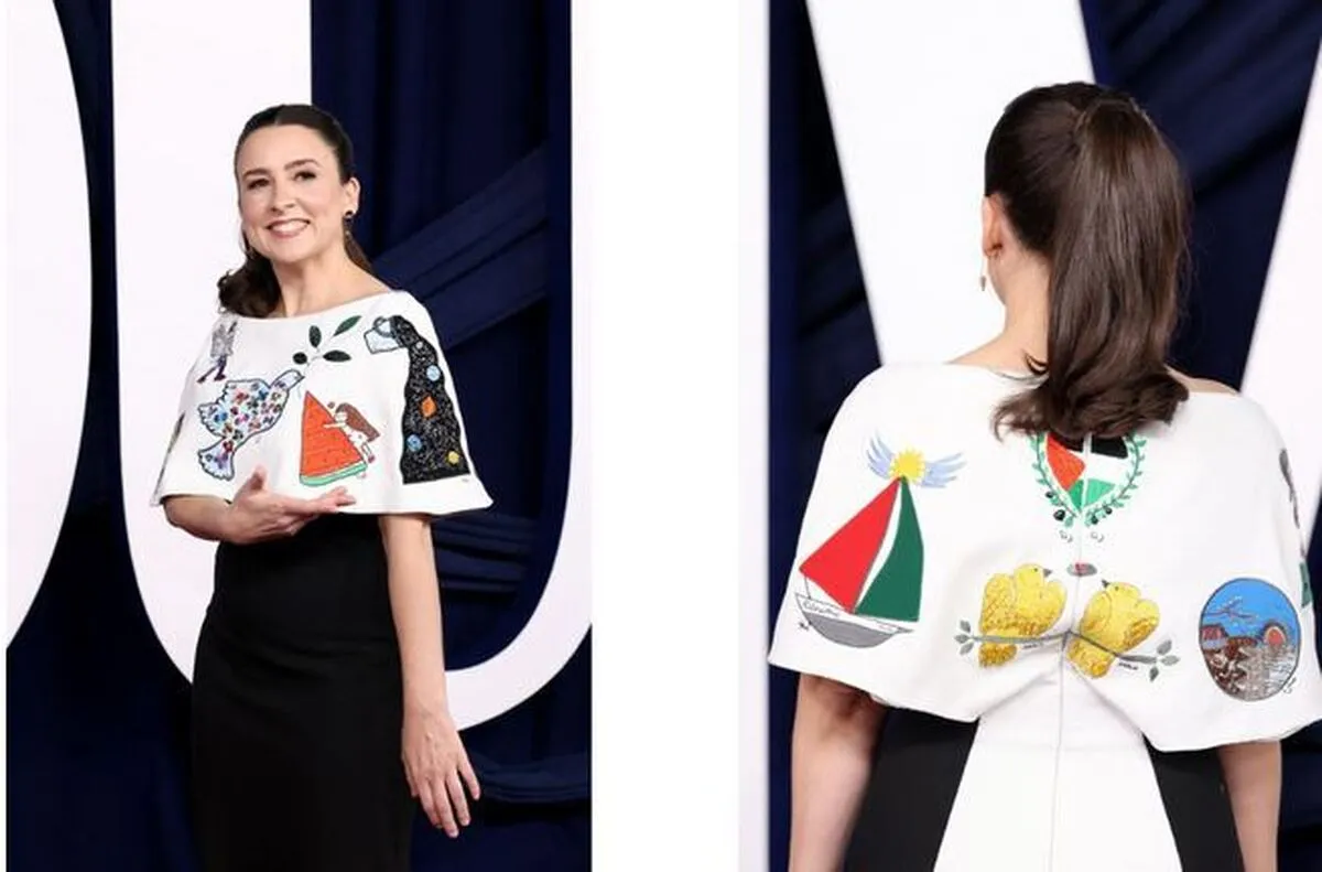 "امشب من این لباس زیبا را می‌پوشم که با آثار هنری از کودکان غزه تزئین شده است. این کودکان واقعا شگفت‌انگیز هستند، بسیار باهوش و دلسوز. من همه نام‌ها و داستان‌های آنها را می‌دانم — لونا، احمد، راما، رنا. من به شما افتخار می‌کنم. افتخار می‌کنم که آثار شما را می‌پوشم. "