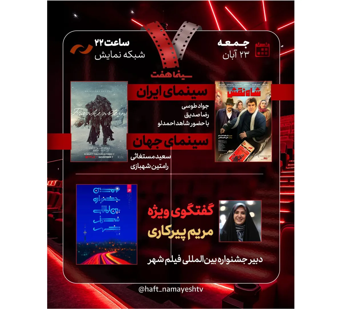 به گزارش خبرگزاری آنا، جدیدترین قسمت از برنامه سینمایی «هفت»، امشب جمعه ۲۳ آبان از ساعت ۲۲ به صورت زنده به آنتن شبکه نمایش میرود.