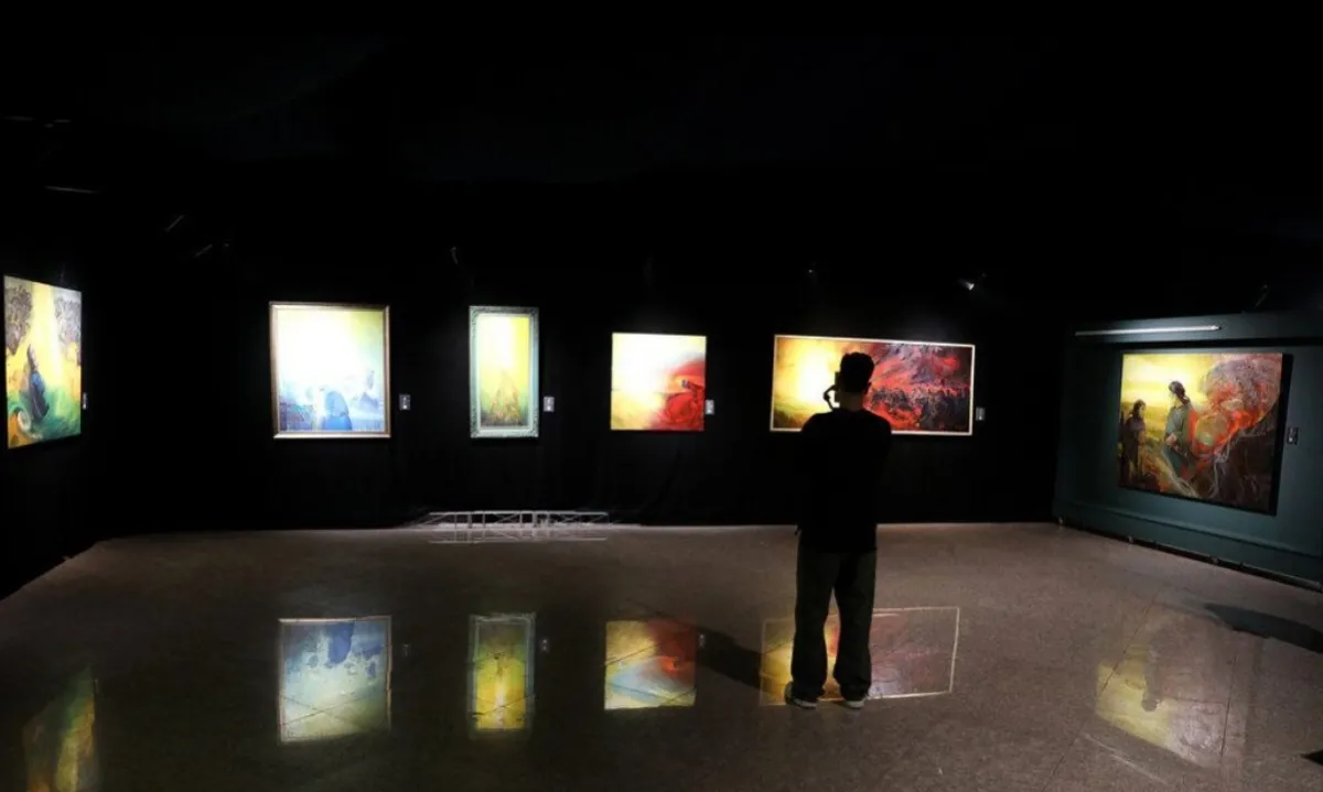 کمی آنطرفتر تصویری از بیتالمقدس در هالهای از نور به چشم میخورد؛ رنگهایی که گویا جان گرفتهاند تا نور را در قامت هنر به تصویر بکشند. تابلوی کناری از ویران شدن صهیون به واسطه ورود لشگر حزب الله در قدس شریف میگوید و دیگری از کسانی که در جنگی ۱۲ روزه باردیگر پیروزی نور بر تاریکی را در سکوت خبری رسانههای غرب، مخابره کردهاند.