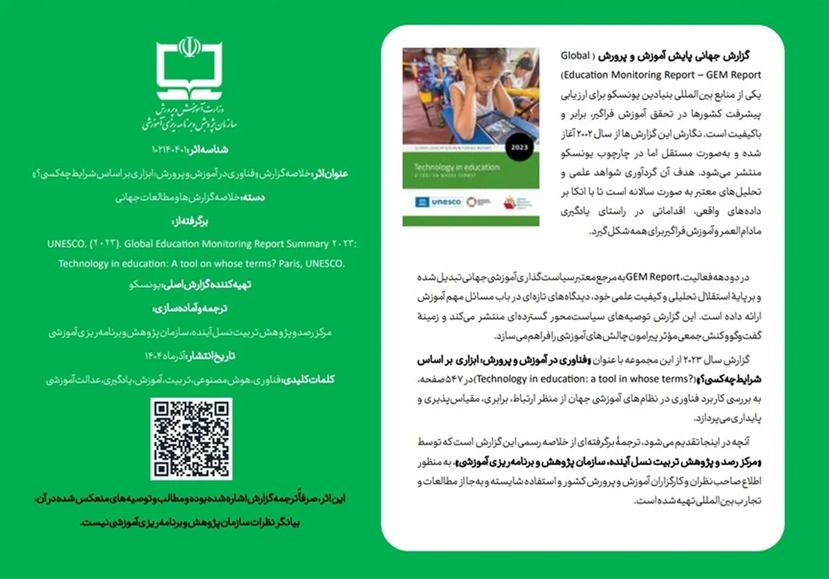 وی افزود: این گزارش که توسط گروه مستقل پایش آموزش جهانی یونسکو در سال ۲۰۲۳ تهیه شده، یکی از جامعترین مطالعات بینالمللی در حوزه نسبت فناوری و آموزش بهشمار میرود و با اتکا بر دادههای تطبیقی، شواهد مستقل و مطالعات جهانی، در بیش از ۵۰۰ صفحه، تصویری دقیق از فرصتها، چالشها و الزامات استفاده مؤثر از فناوری در نظامهای تربیتی ارائه میدهد.