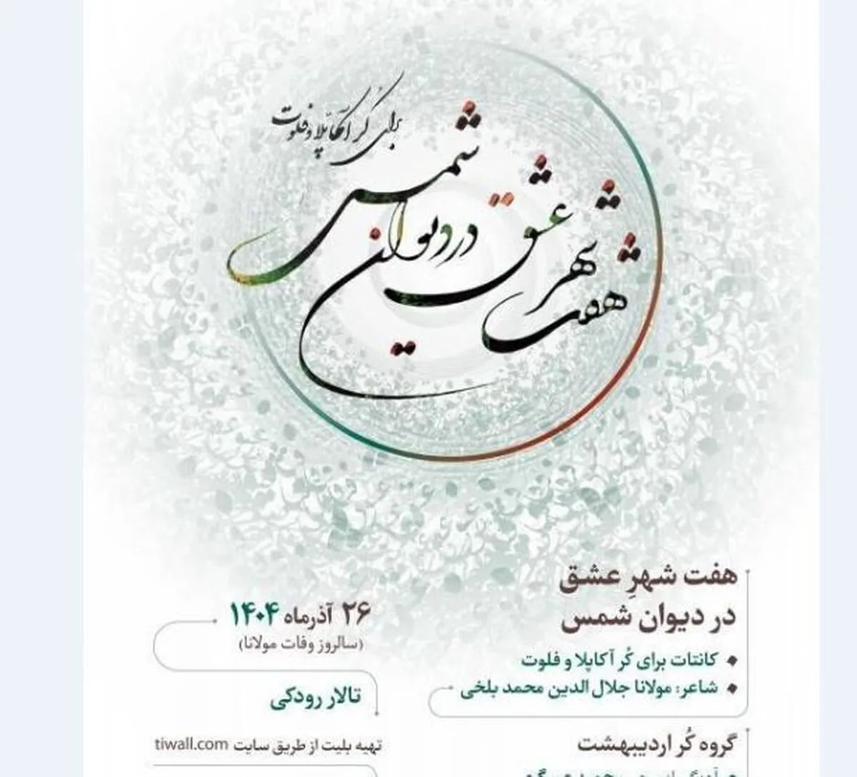 گروه کُر اردیبهشت از ساعت ۲۰ شامگاه چهارشنبه ۲۶ آذر ماه، کنسرت «هفت شهر عشق در دیوان شمس»را به رهبری حمید عسکری در تالار رودکی روی صحنه میبرد.