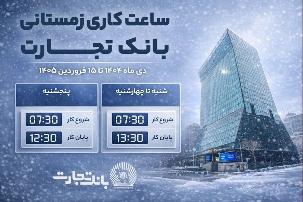 شعب بانک تجارت در سراسر کشور از دوشنبه یکم دی ماه ۱۴۰۴ تا ۱۵ فروردین ماه بر اساس اطلاعیه سازمان اداری و استخدامی کشور و تصویب شورای هماهنگی بانکها از ساعت ۷:۳۰ تا ۱۳:۳۰ به مشتریان خدمترسانی میکنند.