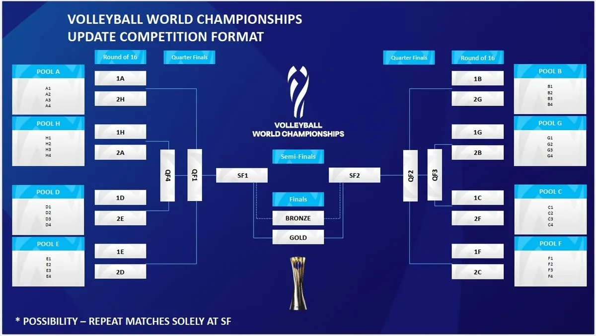 بر این اساس مسابقات والیبال قهرمانی جهان والیبال (FIVB World Championships) از سال ۲۰۲۷ به بعد با این فرمت برگزار خواهد شد که شامل تغییرات کلیدی است از جمله شفافیت و انصاف است به گونه ای که تیم‌ها تا مرحله نیمه‌نهایی با تیمی که در گروهشان بوده دوباره بازی نکنند و از بازی تکراری جلوگیری شود.