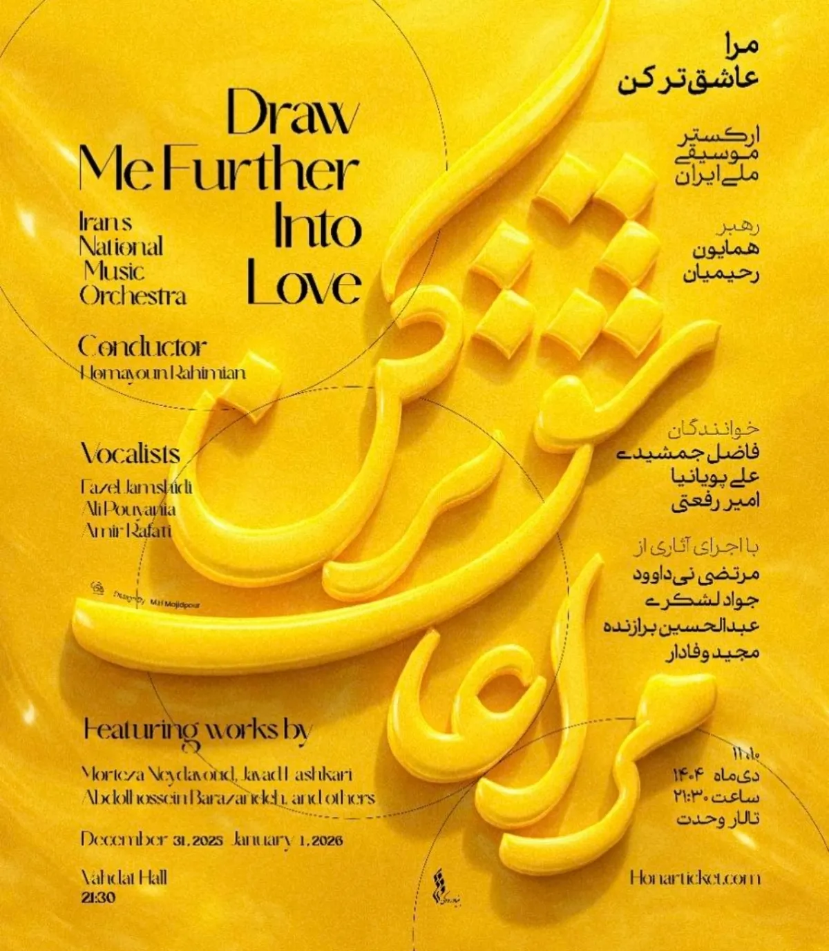 این کنسرت ۱۰ و ۱۱ دی‌ماه ۱۴۰۴، ساعت ۲۱:۳۰ در تالار وحدت برگزار می‌شود و علاقه‌مندان موسیقی ملی و ارکسترال می‌توانند برای تهیه بلیت از طریق سامانه هنرتیکت اقدام کنند.