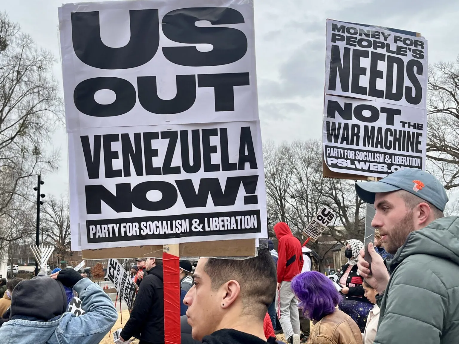 معترضان آمریکایی شعار «زنده باد ونزوئلا» سر دادند و پلاکاردهایی با عناوین «نه به جنگ علیه ونزوئلا»، «پایان امپریالیسم آمریکا» و «نه به خون برای نفت» در دست داشتند.