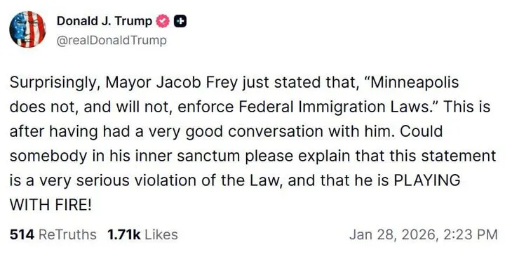 رئیس جمهور آمریکا در این خصوص ادامه داد که از اظهارات جیکوب فری، شگفت زده شده است، زیرا آنها پس از کشته شدن ۲ نفر از ساکنان مینیاپولیس توسط مأموران امنیتی فدرال در جریان کارزارهای گسترده ضد مهاجرتی، «گفتگوی بسیار خوبی» داشتند.
