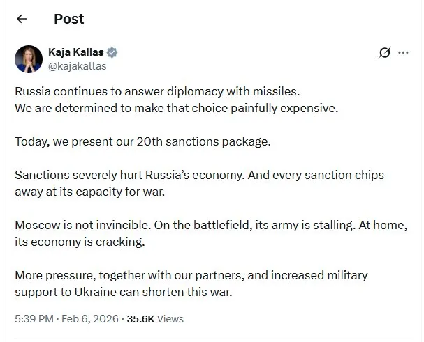 کایا کالاس سپس ادعا کرد: هر تحریم، ظرفیت روسیه را برای جنگ کاهش می‌دهد. مسکو شکست ناپذیر نیست. در میدان نبرد، ارتش آن در حال عقب نشینی است. در داخل، اقتصاد آن در حال فروپاشی است. فشار بیشتر، به همراه شرکای ما، و افزایش حمایت نظامی از اوکراین می‌تواند این جنگ را کوتاه‌تر کند.