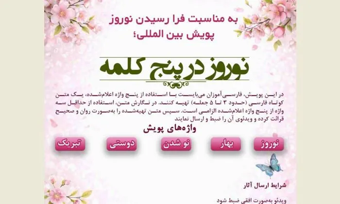 به گزارش خبرگزاری آنا، در این پویش فارسیآموزان در کشورهای مختلف باید با بهرهگیری از پنج واژه «نوروز»، «بهار»، «نو شدن»، «دوستی» و «تبریک» متنی کوتاه به زبان فارسی در قالب سه تا پنج جمله بنویسند که استفاده از حداقل سه واژه از میان این پنج کلمه در متن الزامی است.