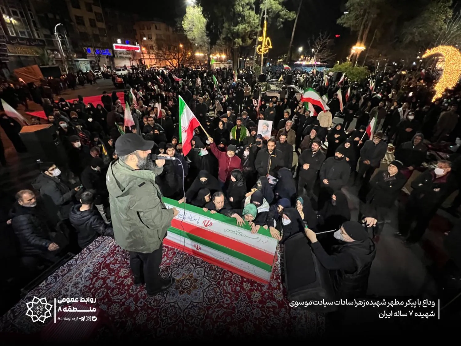 در این شب معنوی آیین وداع با پیکر مطهر شهیده ۷ ساله زهرا سادات سیات موسوی با مداحی حاج أحد قدمی نیز در میان جمعیت حاضر برگزار شد و مردم منطقه ۸ در فضایی آکنده از معنویت و همدلی و با شعار حیدر حیدر با این شهیده کودک وداع کردند.