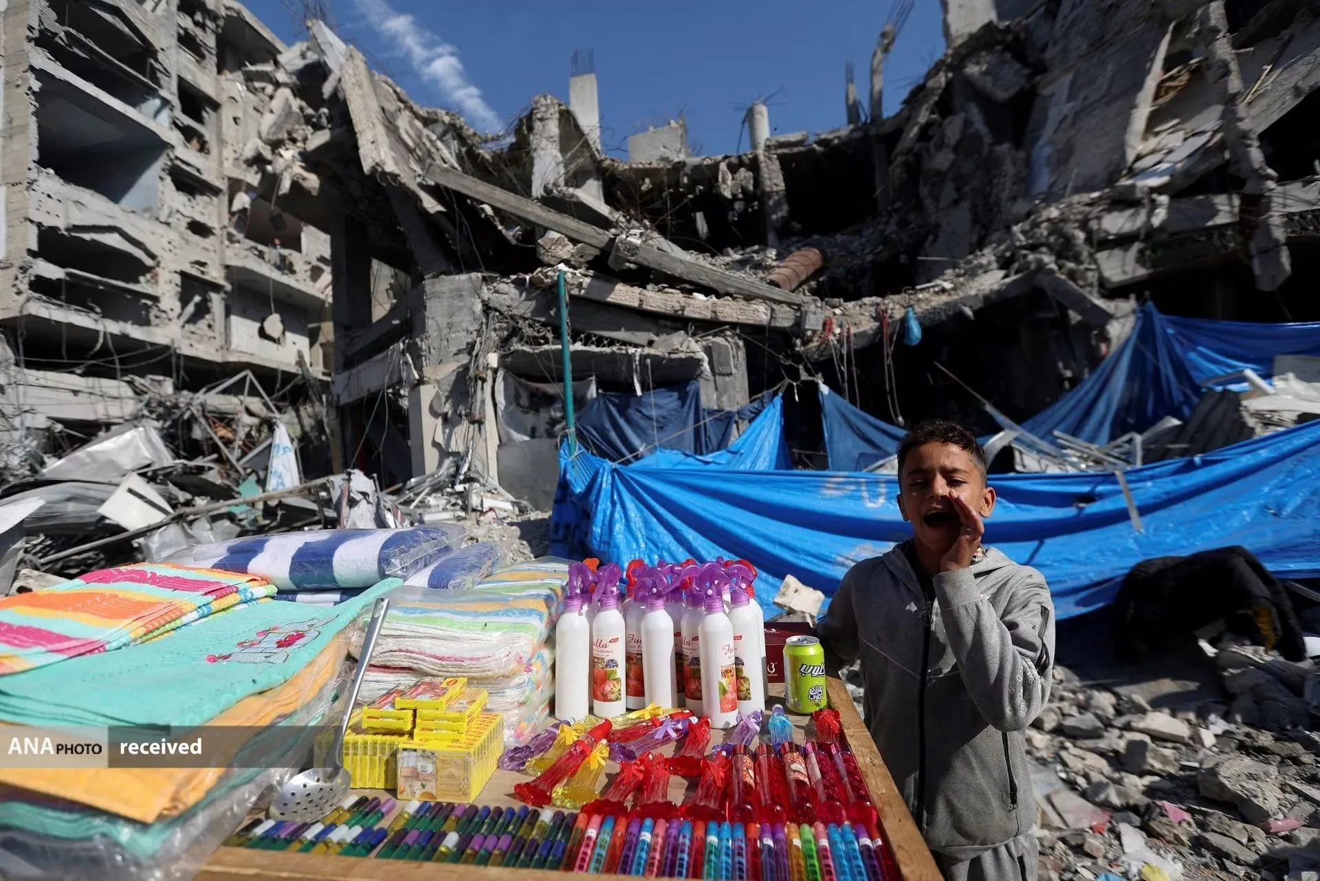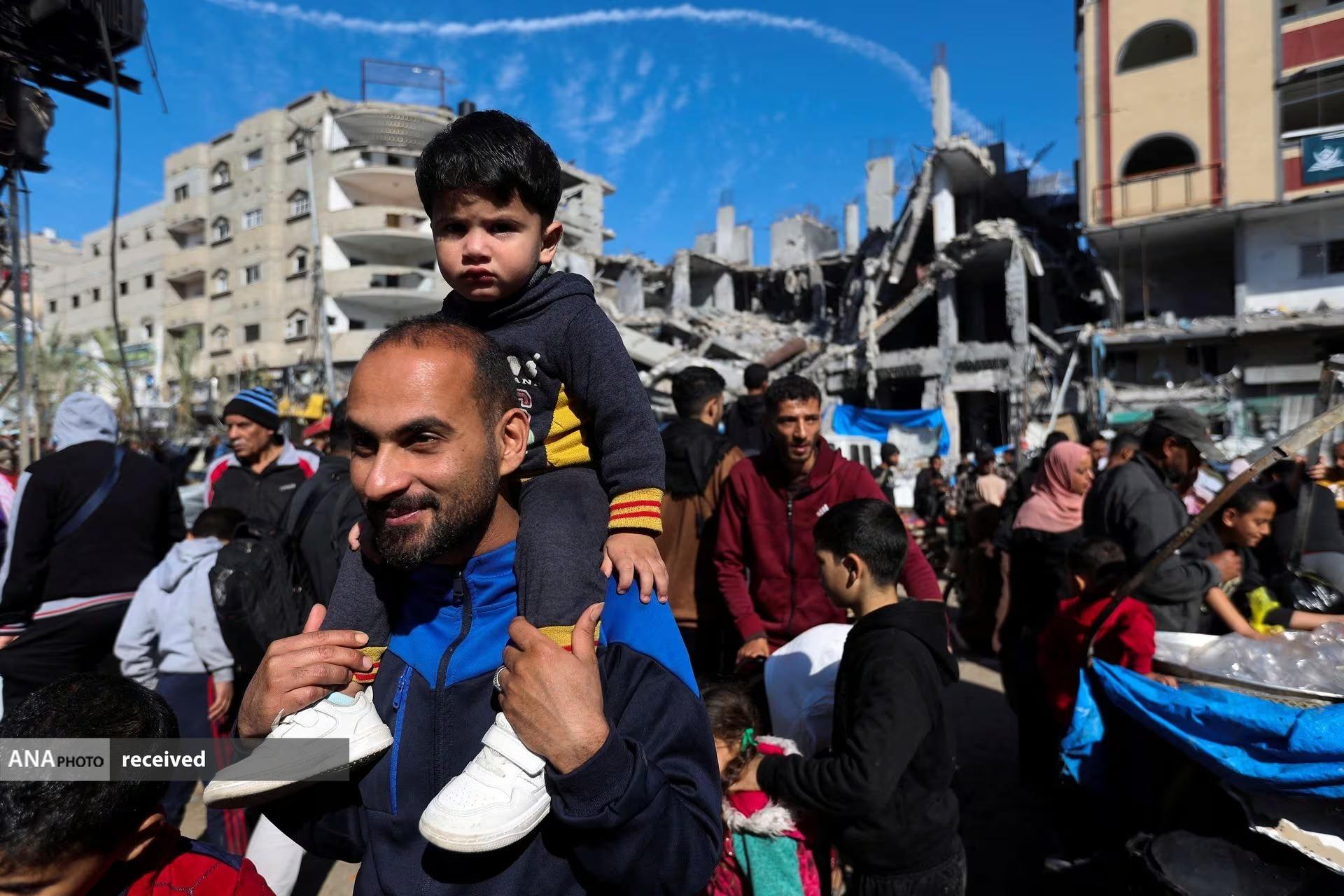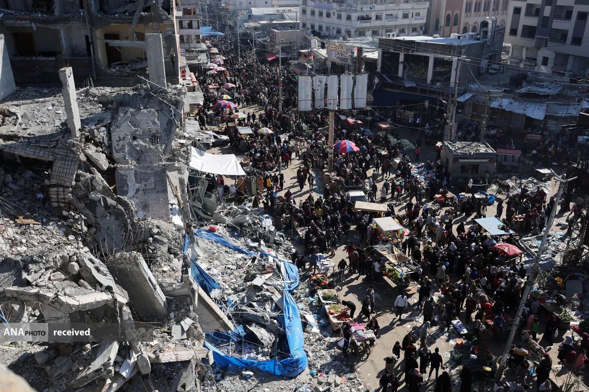 فلسطینیان آواره از جنگ رژیم صهیونیستی در جنوب نوار غزه طی آتشبس هفت روزه و در میان آوار ساختمانهای ویران شده در اثر بمباران به منظور دریافت کمکهای اولیه و خرید اقلام مورد نیاز به بازار خانیونس مراجعه کردند.