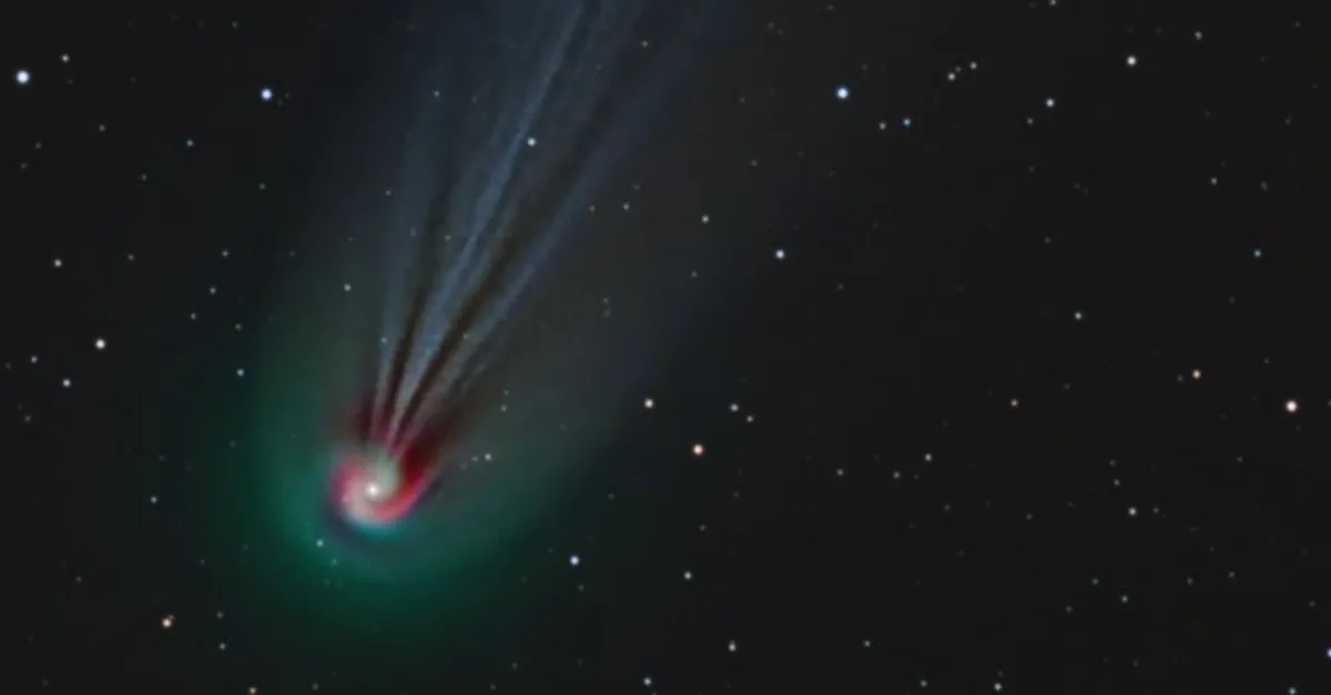 توضیح: یک دنباله دار درخشان در طول خورشید گرفتگی کامل ماه آینده قابل مشاهده خواهد بود. این تصادف بسیار غیرعادی به این دلیل اتفاق میافتد که بازگشت دنبالهدار 12P/Pons-Brooks به درون منظومه شمسی، آن را به طور تصادفی در فاصله 25 درجهای از خورشید در طی خورشید گرفتگی کامل زمین در 8 آوریل قرار داده است. در حال حاضر این دنباله دار به سختی با چشم غیر مسلح و بدون هیچ گونه کمک رصدی مانند تلسکوپ یا دوربین دوچشمی قابل مشاهده است.به بهترین وجه میتوان آن را با دوربین دوچشمی در اوایل عصر در سمت صورت فلکی ماهی مشاهده کرد. با این حال، دنبالهدار Pons-Brooks حتی در حال حاضر نیز با ابزارهای حرفهایتر تصویر خوبی را بر جای میگذارد. تصویر اصلی دارای سه رنگ است: دم یونی متحرک دنباله دار آبی روشن، کمای بیرونی (outer coma) آن سبز است و گازهای قرمز درخشان به صورت مارپیچی در اطراف کما وجود دارد. تصور می شود که این مارپیچ ناشی از گازی است که توسط هسته به آرامی ناشی از چرخش دنباله دارخارج میشود. پیشبینی دقیق میزان روشنایی دنبالهدار Pons-Brooksدر حالی که در 8 آوریل از مقابل خورشید حرکت میکند، دشوار است.