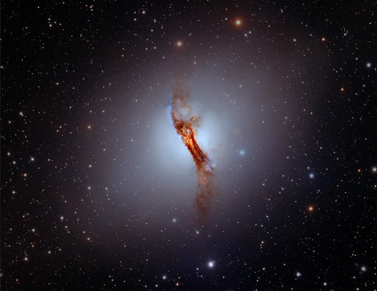 قنطورس اِی (NGC 5128) کهکشانی است که به ما نزدیک است و حدود 12 میلیون سال نوری از ما فاصله دارد. این سیاهچاله در مرکز خود یک سیاهچاله بسیار پرجرم دارد که به طور فعال ماده را مصرف میکند. این سیاهچاله فواره های انرژی را به فضا میفرستد که فقط در امواج رادیویی قابل مشاهده هستند. با این حال درخشش نور آن قابل رؤیت است. تصویر قنطورس A با استفاده از یک تلسکوپ 5 اینچی در مدت 11.6 ساعت در فیلترهای نوری مختلف (LRGB) گرفته شد.