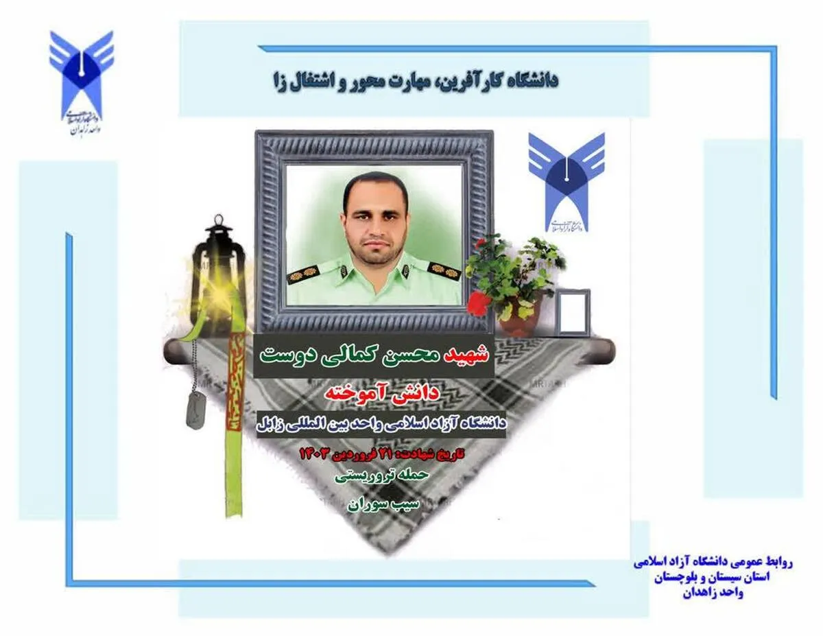 در این پیام مطرح شده است: اینجانب با محکوم کردن این اقدام تروریستی جنایتبار، شهادت شهید والامقام و معزز، شهید محسن کمالینسب، دانشآموخته دانشگاه آزاد اسلامی واحد زابل را محضر حضرت صاحبالزمان(عج)، مقام معظم رهبری (مدظلهالعالی)، تمام مردم عزیز ایران بهخصوص خانواده بزرگ دانشگاه آزاد اسلامی و اهل بیت معظم و معزز شهید تسلیت عرض میکنم.