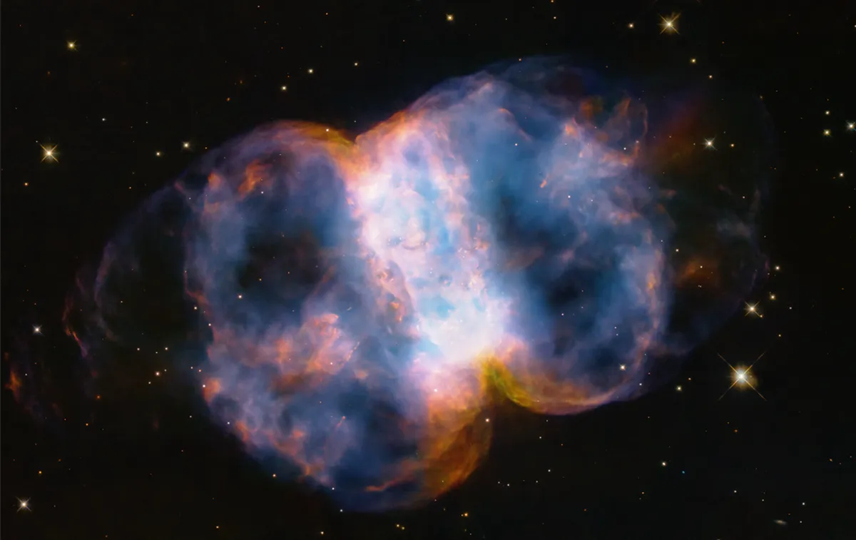 در جشن سی و چهارمین سالگرد پرتاب تلسکوپ فضایی هابل ناسا، اخترشناسان یک عکس فوری از سحابی دمبل کوچک، که با نام مسیه 76 یا M76 نیز شناخته می شود، در فاصله 3400 سال نوری از ما در صورت فلکی مدور قطبی شمالی برسائوس گرفتند. نام «دمبل کوچک» از شکل آن گرفته شده است که ساختاری دو لوبی از گازهای رنگارنگ، خالدار و درخشان شبیه بادکنکی است که دور کمرش بسته شده است. لوب ها مانند یک بالن در حال باد کردن، از یک ستاره در حال مرگ که به صورت یک نقطه سفید در مرکز دیده می شود رو به فضا منبسط می شوند. تشعشعات فرابنفش از ستاره فوق داغ باعث درخشش گازها می شود. رنگ قرمز ناشی از نیتروژن است و آبی از اکسیژن است.
