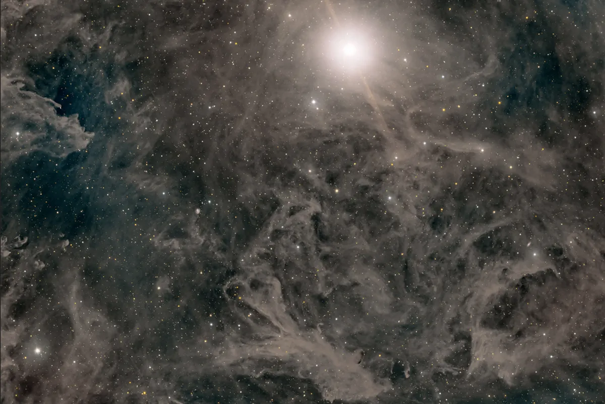 این عکس توسط جاش جونز اهل پندلتون، اورگان ثبت شده است. مندل-ویلسون 1 (MW1) یک جرم منظم در اعماق آسمان نیست. در واقع این گاز بسیار کم رنگ در خارج از صفحه کهکشان ما قرار دارد. اگرچه به نظر می رسد نزدیک به پولاریس اما بسیار دورتر است. این نوع اجرام به عنوان سحابی های شار یکپارچه شناخته می شوند و ابرهایی که آنها را تشکیل می دهند گاهی اوقات به عنوان سیروس کهکشانی نامیده می شوند. برای ثبت تصاویر MW1، عکاس از یک اخترشناس 11 اینچی f/2.2 Celestron RASA استفاده کرد و 12.75 ساعت را صرف جمع آوری داده ها با استفاده از فیلترهای RGB کرد.