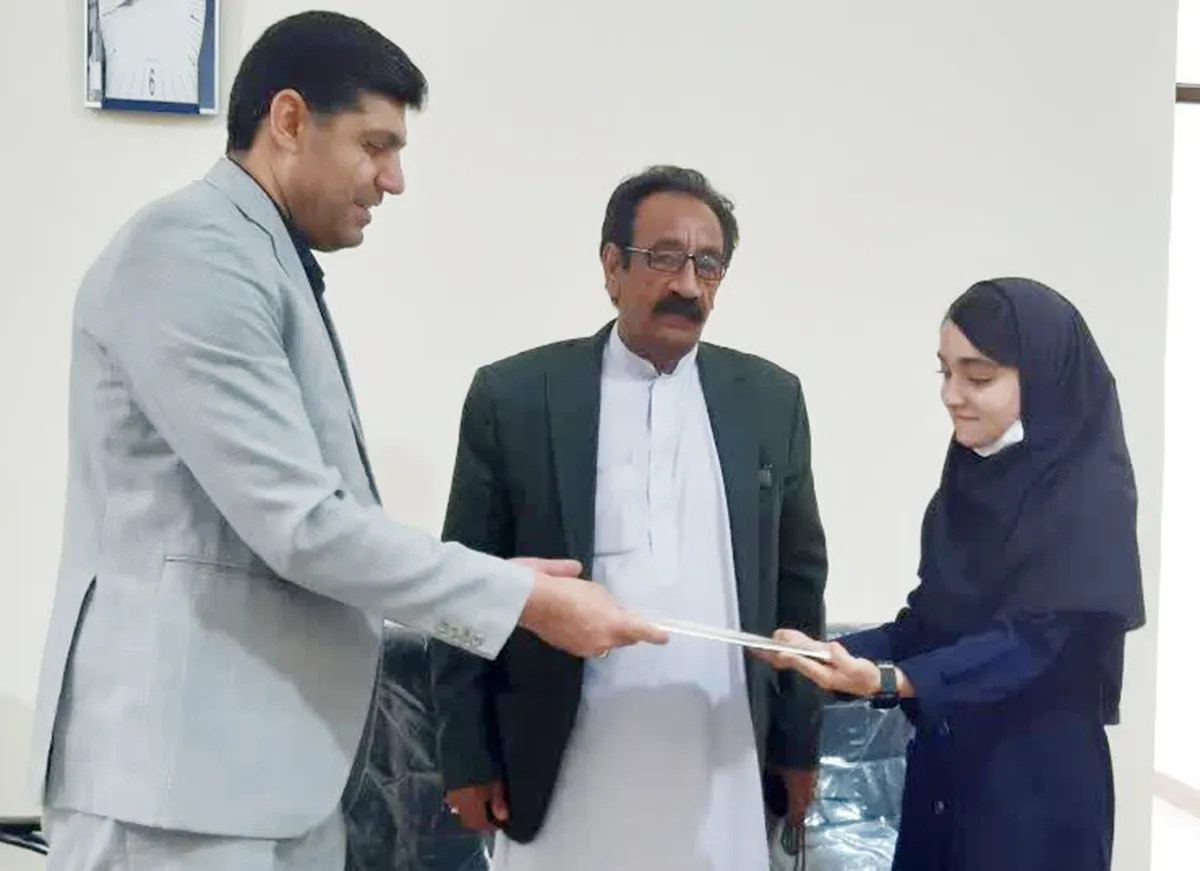 در پایان با حضور ولی دانشآموز و صنوبری مدیر دبیرستان دخترانه دوره دوم متوسطه سمای زابل با اهدای لوح سپاس و هدیه از این دانشآموز افتخارآفرین تجلیل شد.