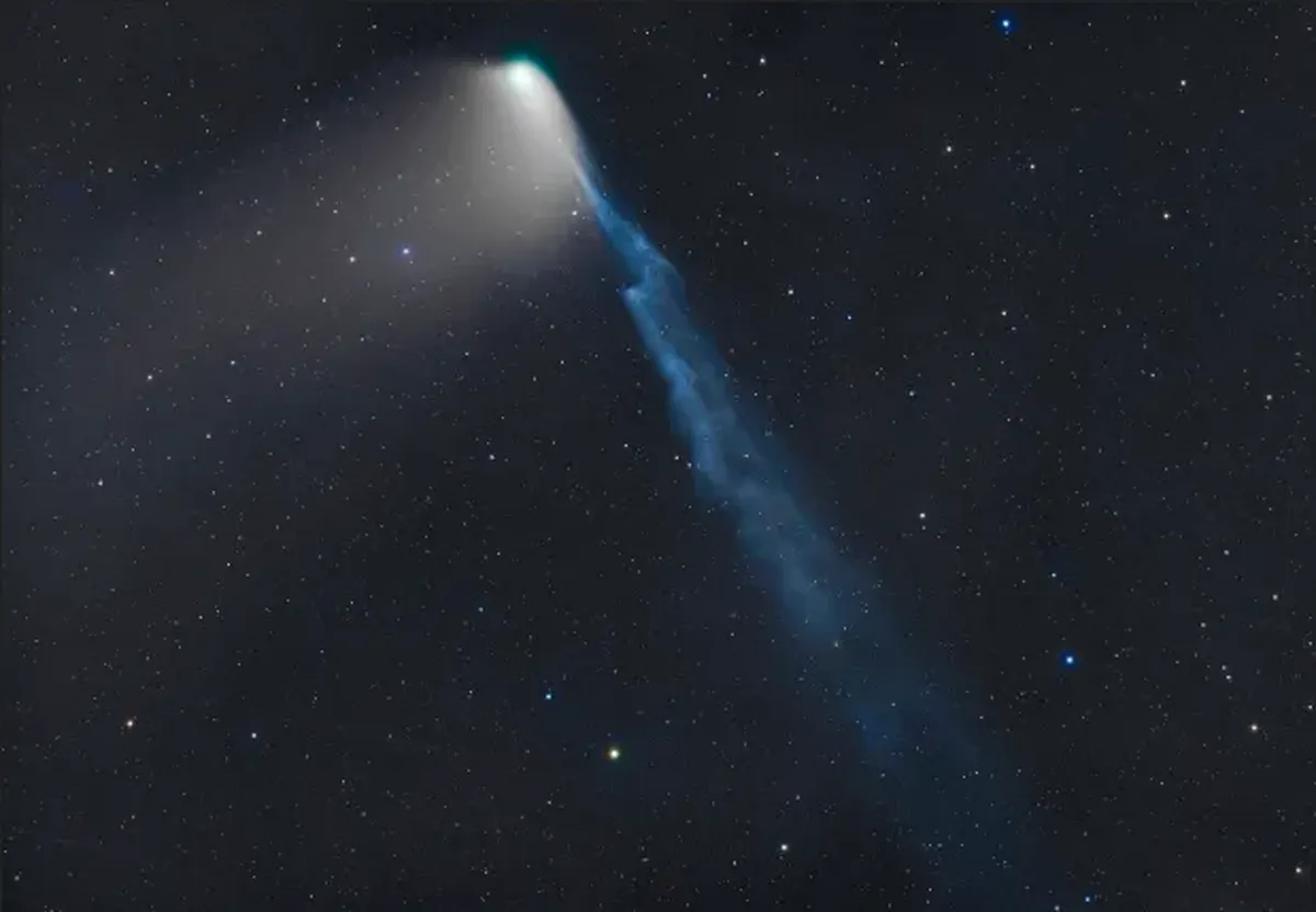 جرالد رامان (Gerald Rhemann)، مایکل جاگر (Michael Jäge) و لوکاس دمتز (Lukas Demetz) این عکس را از مزرعههاکوس، نامیبیا گرفته اند. در تصویری که در 4 می گرفته شد، خمیدگی قابل توجهی در دم آبی دنباله دار 12P/Pons-Brooks دیده میشود. این خمیدگی نشان دهنده یک رویداد قطع ارتباط است که زمانی اتفاق میافتد که طوفان خورشیدی دم یونی را از هسته دنباله دار جدا میکند.