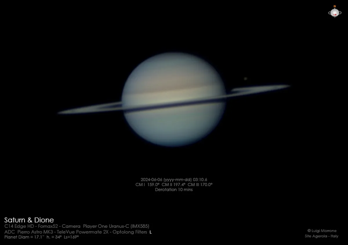 این عکس توسط لوئیجی مورونه (Luigi Morrone) در آگرولا ایتالیا ثبت شده است. تاریخ/زمان عکس به 06 ژوئن 2024 برمی گردد. تجهیزات مورد استفاده شامل تلسکوپ C14 Edge HD، پایه Fornax52، دوربین Player One Uranus-C، فیلتر OPTOLONG L، Barlow Televue Powermate، 2x ADC Pietro Astro MK3 است. این عکس زحل و قمر آن دیون را در 6 ژوئن 2024 نشان میدهد که کمی قبل از طلوع خورشید گرفته شده است. این تصویر در شرایط آب و هوایی خوب با پردازش جداگانه برای دیون گرفته شده است.