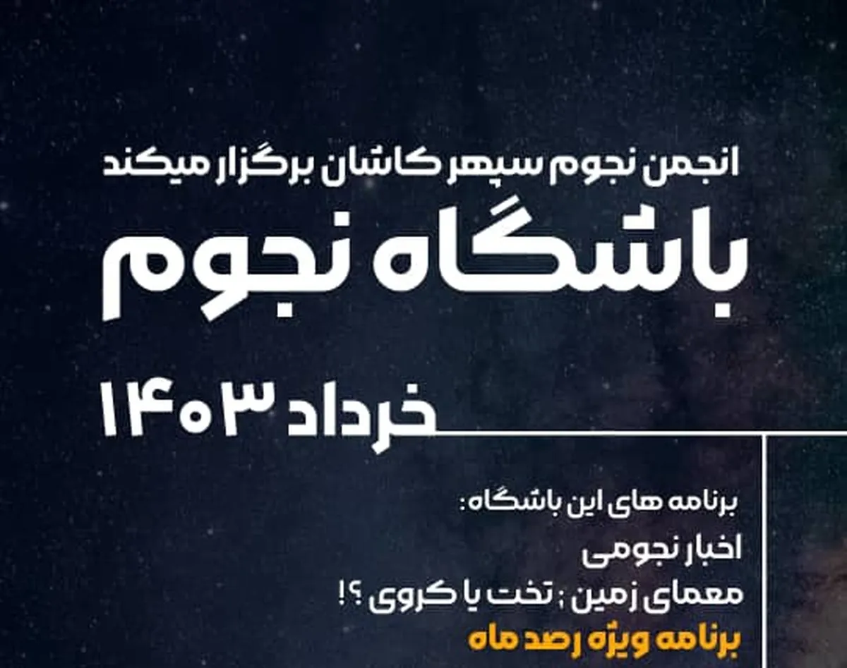 این برنامه عمومی چهارشنبه ۳۰ خرداد ساعت ۱۷:۴۵ در مرکز نجوم سپهر کاشان واقع در خیابان محتشم برگزار میشود.