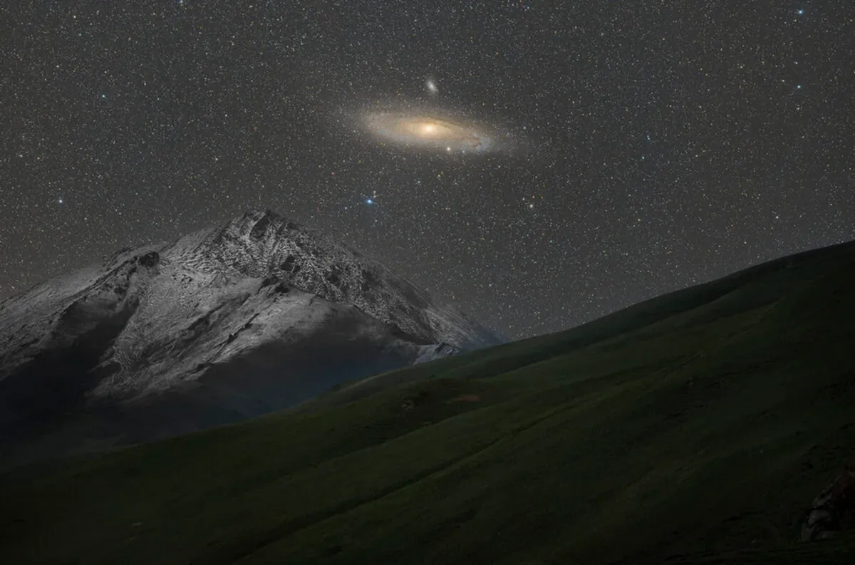 باسودب چاکرابارتی (Basudeb Chakrabarti) اهل کلکته هند است. او یک عکس با دوربین بدون آینه فولفریم نیکون Z 6II و لنز 135 میلی متری f/2 گرفته شده است. کهکشان آندرومدا (M31) را در آسمان کوههای قرقیزستان در نزدیکی تاش رباط(Tash Rabat) نشان می دهد. این عکس از شصت تصویر با نوردهی 20 ثانیه ای با ISO 1000 برای آسمان و سه تصویر با نوردهی 2 دقیقه ای با ISO 1600 برای تصویر پیش زمینه تشکیل شده است.