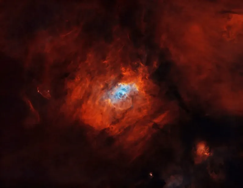 استیو لئونارد (Steve Leonard) اهل مارکهام، انتاریو، کانادا است. سحابی حباب (NGC 7635) یک سحابی انتشاری است که ستاره SAO 20575 در صورت فلکی Cassiopeia را احاطه کرده است. پوسته ضعیف آن از بادهای شدید ستارهای تشکیل شده است. عکاس از یک تلسکوپ انکسار 4.5 اینچی f/5.7 استفاده کرده است. آنها برای ثبت تصویر 24 ساعت داده SHO و 3 ساعت داده RGB را ضبط کردند. تصویر نهایی ترکیبی از سبک پالتهابل و پالت پویا فوراکس است.