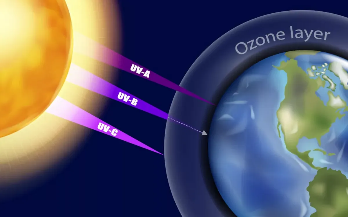 لایه ازون در استراتوسفر (بخشی از جو بین 15 تا 35 کیلومتر بالاتر از سطح زمین) قرار دارد. این لایه عمدتاً دربرگیرنده مولکول‌های ازون است که خود از سه اتم اکسیژن تشکیل شده‌اند. لایه ازون بخش قابل توجهی از تابش UV خورشید، به ویژه اشعه UV-B و UV-C را جذب می‌کند. این اشکال پرتوهای فرابنفش خطرناکی هستند زیرا انرژی کافی برای آسیب رساندن به مولکول‌های بیولوژیکی مانند DNA را در گیاهان، حیوانات و صدالبته انسان‌ها دارند.