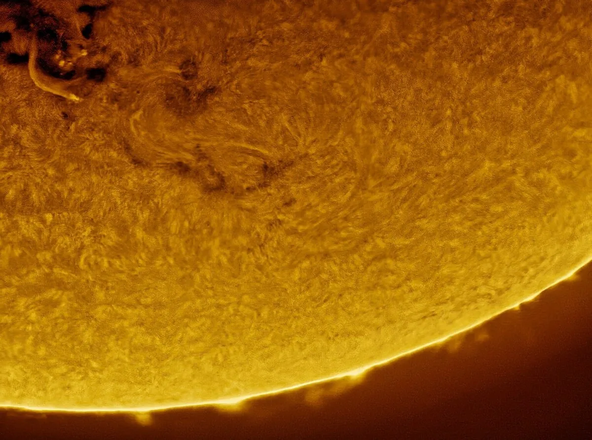 این عکس خورشید از شمال پوتوماک، مریلند گرفته شده است. تاریخ/زمان ثبت عکس 20 سپتامبر 2024 / 11:37 صبح است. تجهیزات مورد استفاده شامل تلسکوپ Questar 3.5 اینچی استاندارد MCT مدل 1965 با فیلتر کوارک کروموسفر ترکیبی H-Alpha وTele-Vue 2.5X Powermate ، دوربین ZWO ASI174MM است.