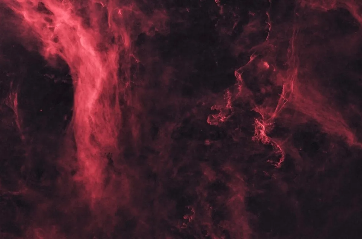 این تصویر توسط دیوید جویس (David Joyce) از کنتاکی ثبت شده است. سحابی سنجاقک (Sharpless 2-114) در سیگنوس قرار دارد. این سحابی از نوع سحابیهای انتشاری ضعیف است. درخشش این سحابی عمدتاً به دلیل خط طیف نوری سرخ عمیق مرئی اتم هیدروژن است. البته انتشار کمی در طول موجهای OIII یا SII نیز وجود دارد. این تصویر 18.5 ساعت دادهها را نشان میدهد و با یک دوربین 2.8 اینچی f/6 گرفته شده است.