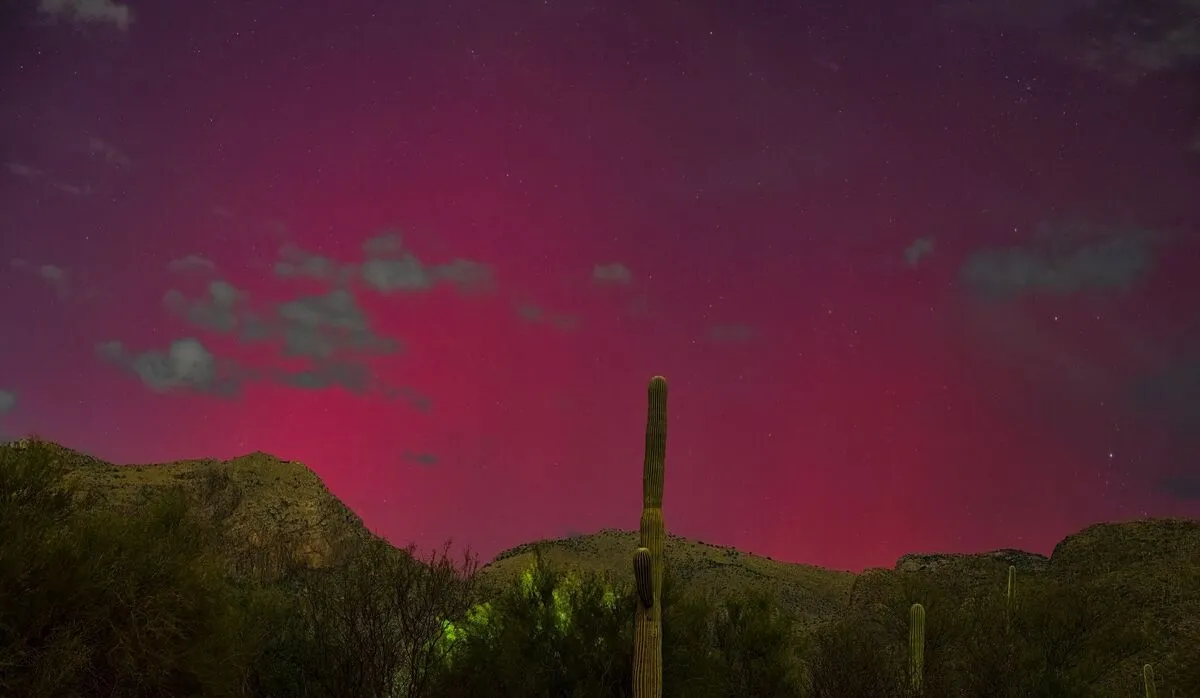 این تصویر خیرهکننده شفق قطبی بر فراز کوهپایههای کاتالینا در توسان ثبت شده است. عکاس الیوت هرمان آن را در تاریخ 10/10/2024 ساعت 22:30 عکسبرداری کرد. تجهیزات مورد استفاده او دوربین نیکون Z7II با ابزار Nikon 50 mm F1.8 بود.