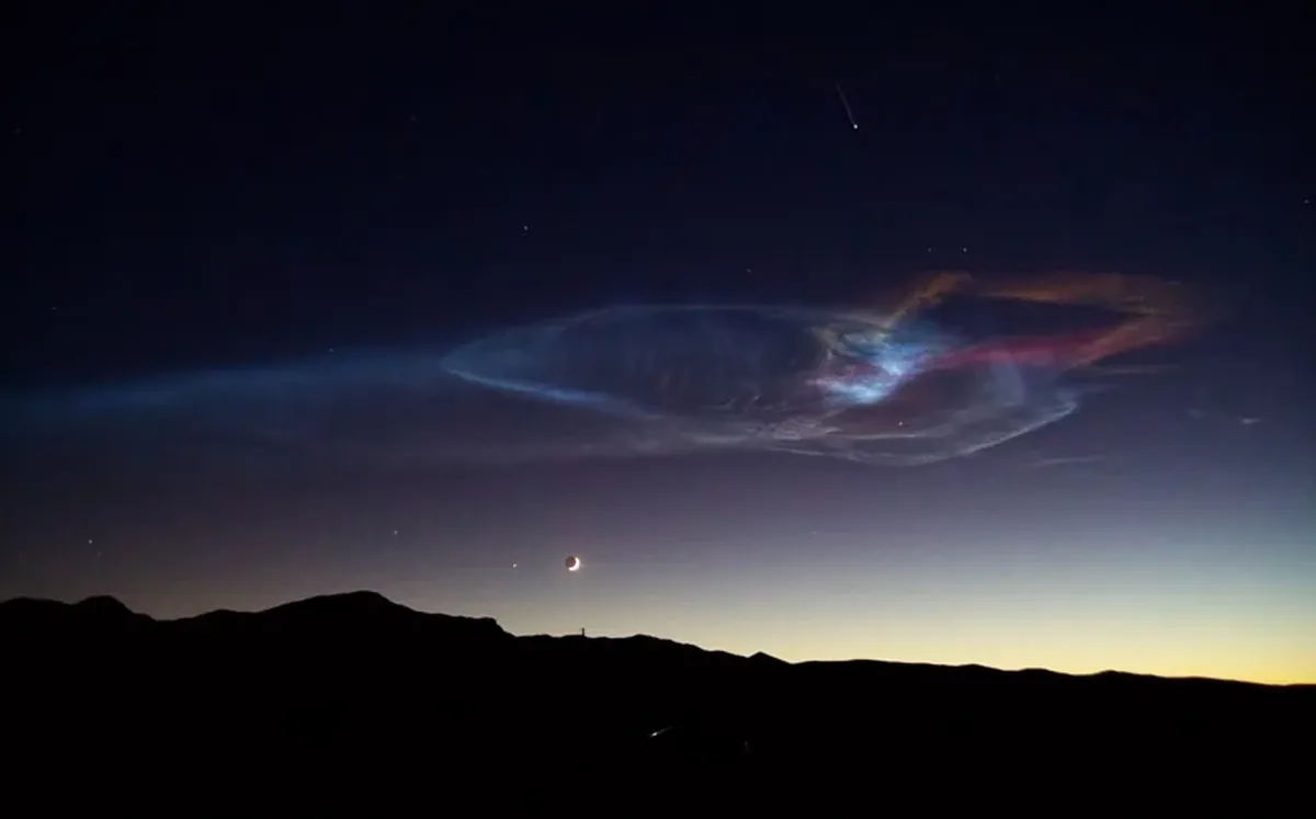 این عکس توسط تیم سونگ جونز در تیم سونگ جونز ثبت شده است. ابرهای رنگارنگ توسط موشک فالکون 9 اسپیس ایکس بر جا مانده است. این هواپیما در شب 27 اکتبر از پایگاه نیروی هوایی وندنبرگ در کالیفرنیا به فضا پرتاب شد. این موشک ماهوارههای جدید استارلینک را به مدار برد.