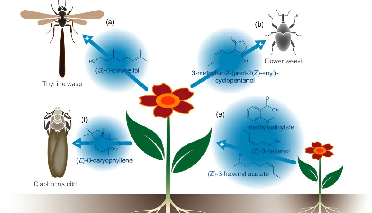 هنگامی که یک حشره به گیاهی حمله می‌کند، گیاه مواد شیمیایی خاصی را در هوا آزاد می‌کند. این مواد شیمیایی به عنوان ترکیبات آلی فرار (VOC) شناخته می‌شوند. این ترکیبات مانند یک سیگنال هشدار عمل می‌کنند و گیاهان مجاور می‌توانند این اعلام خطر را از طریق برگ‌های خود حس کنند. وقتی آنها این رایحه را تشخیص دادند، می‌فهمند که یک حشره در این نزدیکی است و باید آماده شوند.