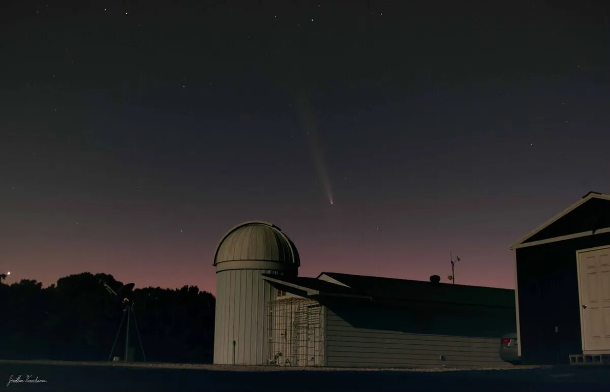 این عکس دنباله دار سوچینشان-اتلس را در بالای مرکز یادگیری و گنبد تلسکوپ در سایت این انجمن نجوم در کانی، اوکلاهما نشان میدهد. سیاره زهره در سمت چپ پایین کادر، بالای درختان قرار دارد!