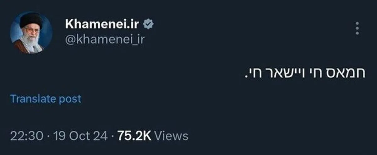 توئیت عبری رسانه KHAMENEI.IR در پی شهادت یحیی سنوار رئیس جنبش مقاومت اسلامی فلسطین(حماس) جملهای از پیام رهبر معظم انقلاب را منتشر کرد.