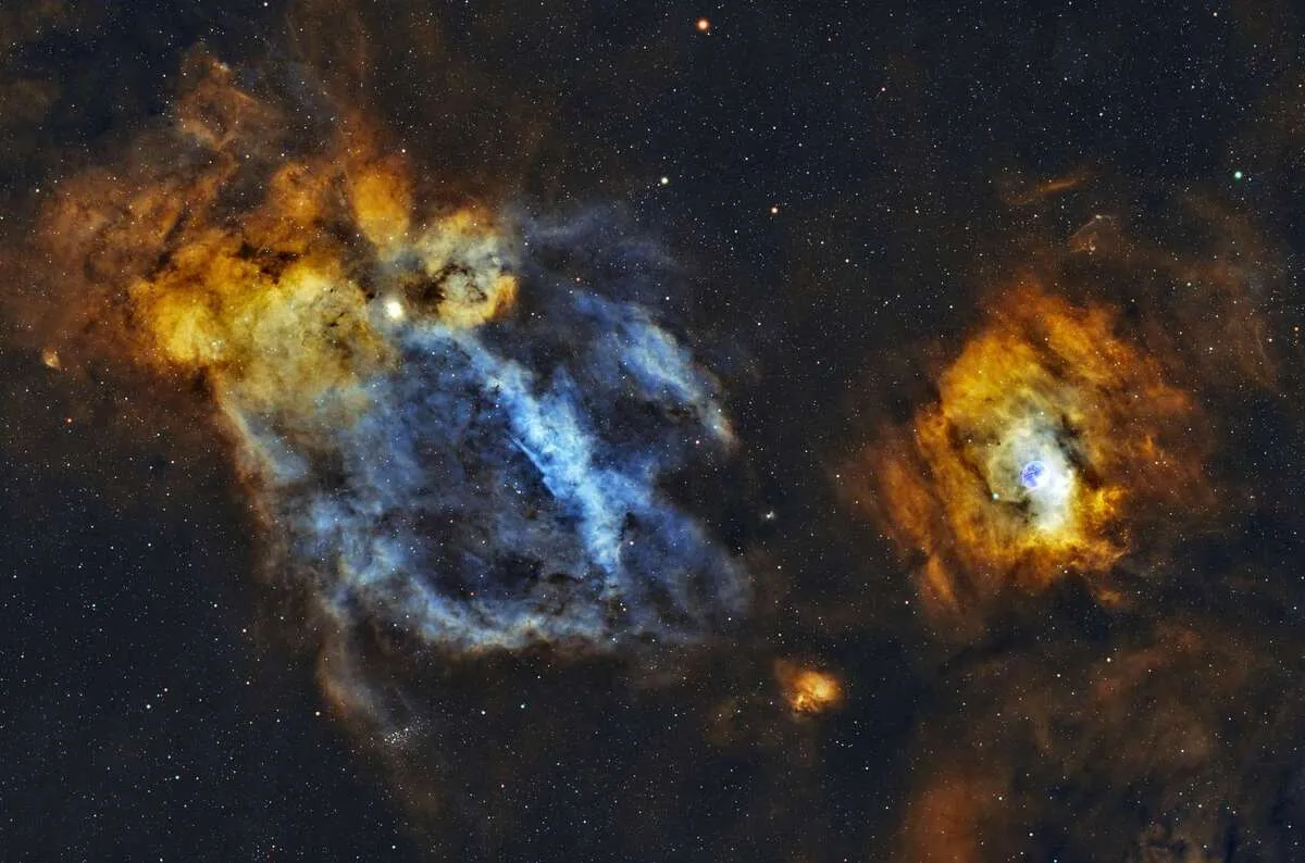 NGC 6357 یک منطقه کلیدی برای تشکیل ستاره در کهکشان راه شیری است. بسیاری از ستارههای اولیه نوع O نام دارد. این ستارهها حبابهایی را در اطراف خوشههای خود در ابر مولکولی ایجاد میکنند. NGC 7635 یک سحابی گسیلشی ناحیه H II در صورت فلکی ذاتالکرسی نزدیک خوشه باز مسیه 52 است. "حباب" توسط باد ستاره ای از ستاره جوان داغ با قدر 8.7 ساخته شده است. این سحابی به یک ابر مولکولی غول پیکر نزدیک است و با انبساطش باعث درخشش ابر میشود.