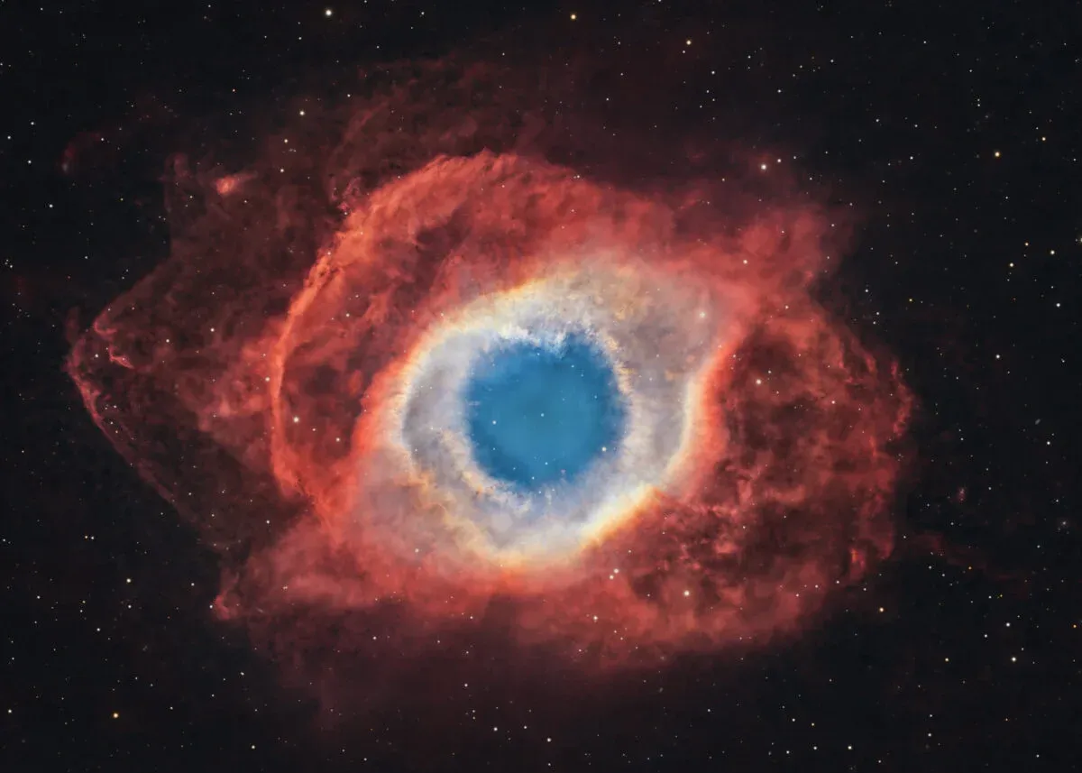 NGC 7293 به سحابی هلیکس معروف است. این سحابی از نوع سحابی های سیاره ای است که در فاصله 650 سال نوری از ما در صورت فلکی دلو قرار دارد. زمانی که ستاره در حال مرگ لایه های بیرونی خود را می ریزد و سوخت خود را از دست می دهد، چنین منظره ای شکل می گیرد. اگرچه شما یک تصویر را می بینید اما این تصویر از 342.5 ساعت داده تشکیل شده است. نوزده عکاس آماتور در این پروژه مشارکت داشتند. آنها از تلسکوپ هایی با اندازه های 2.8 اینچ تا 12 اینچ استفاده کردند. زمان نوردهی طولانی جزئیات زیادی را در پوسته های هیدروژن یونیزه شده بیرونی نشان می دهد.