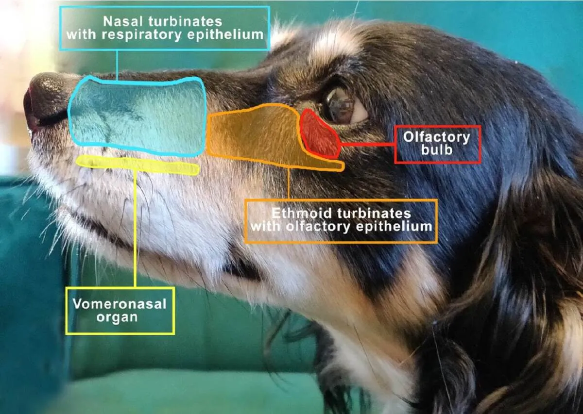هنگامی که سگ نفس میکشد، هوا از طریق سوراخهای بینی به دو مسیر جداگانه تقسیم میشود. یکی از این مسیرها مستقیماً به ریهها میرود و فرآیند تنفس را کلید میزند، در حالی که مسیر دیگر به ناحیهای اختصاصی برای «بویایی» هدایت میشود. این بخش بویایی به دلیل وجود بافتهایی به نام روپوشه بویایی (Olfactory Epithelium) که دارای گیرندههای بویایی (Olfactory Receptors) است میتواند مولکولهای بویایی را جذب و تحلیل کند.