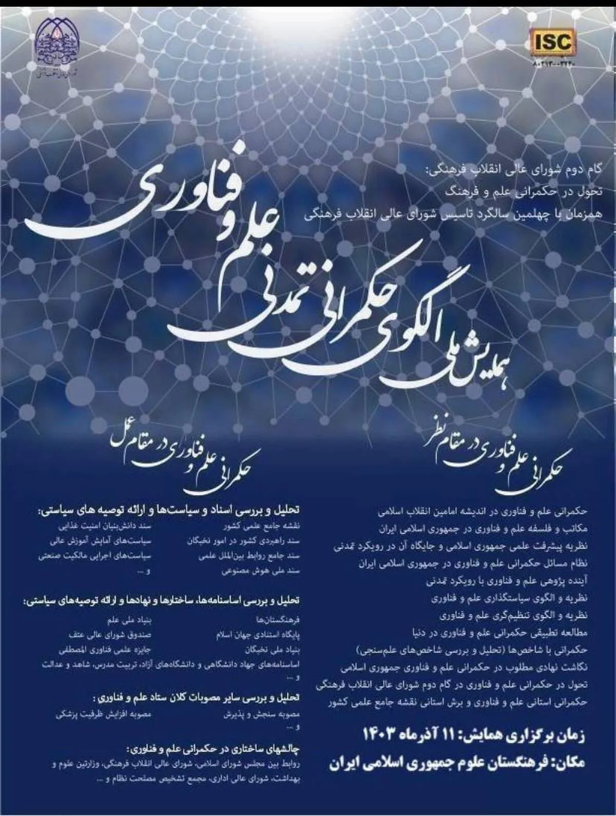 به گزارش خبرگزاری آنا، در آستانه چهلمین سالگرد تأسیس شورای عالی انقلاب فرهنگی، اولین همایش ملی الگوی حکمرانی تمدنی علم و فناوری به همت ستاد علم و فناوری شورای عالی انقلاب فرهنگی، صبح و عصر روز یکشنبه ۱۱ آذرماه در محل فرهنگستان علوم جمهوری اسلامی ایران برگزار میشود.