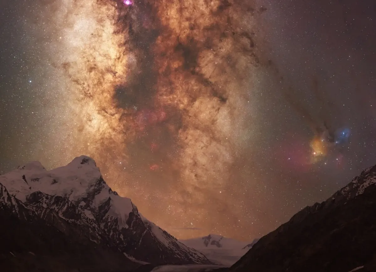 این سحابیها در کنار ستارههای کمربند شکارچی و ستارگان درخشان بتلگیس (Betelgeuse) و ریگل (Rigel) هستند. جدای از اجرم نجومی دوردست، سیاره مشتری که بزرگترین جرم نجومی در داخل منظومه شمسی محسوب میشود، در آسمان بالای قلههای برفی میدرخشد.