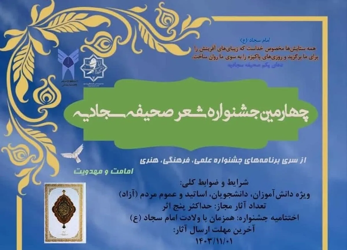 احسان محمدینژاد دبیر اجرایی جشنواره شعر صحیفه از سری برنامههای چهارمین جشنواره امامت و مهدویت دانشگاه آزاد اسلامی در گفتوگو با خبرنگار آنا اعلام کرد که به دلیل تقاضای شاعران، مهلت ارسال اثر به این جشنواره تا ۵ بهمن تمدید شد.