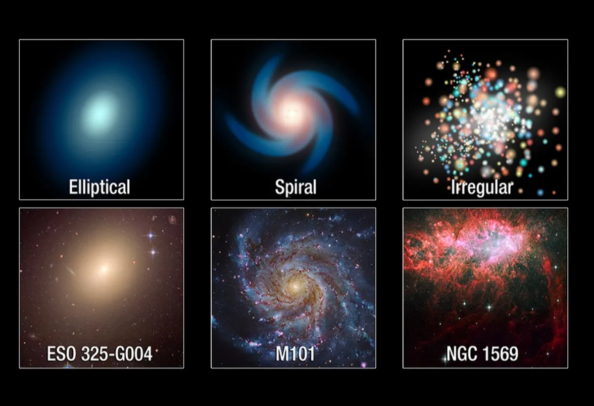 کهکشانها معمولاً به سه دسته اصلی تقسیم میشوند؛ مارپیچی، بیضوی و نامنظم. کهکشانهای مارپیچی دارای بازوهای مشخصی هستند که ستارهها و گازها را در خود جای دادهاند. این نوع کهکشانها معمولاً جوانتر هستند و فعالیتهای ستارهزایی در آنها بیشتر دیده میشود. در مقابل، کهکشانهای بیضوی معمولاً قدیمیتر هستند و ستارههای آنها بیشتر به صورت یکپارچه و بدون ساختار خاصی توزیع شدهاند. این نوع کهکشانها معمولاً دارای ستارههای پیرتر هستند و فعالیت ستارهزایی در آنها کمتر مشاهده میشود.