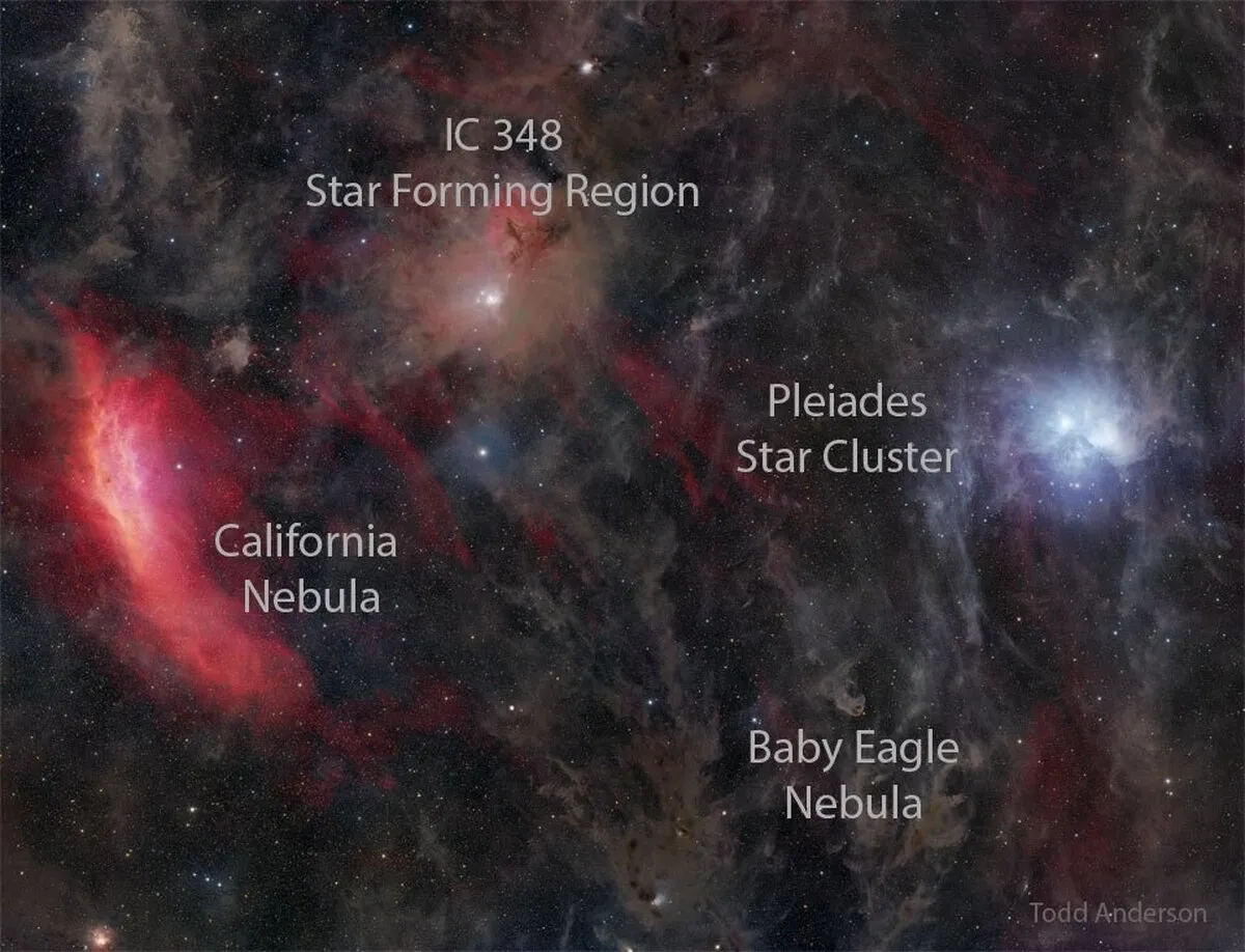در سمت چپ، سحابی کالیفرنیا با نور قرمز خود توجه را جلب میکند. به دلیل شباهت شکلش به نقشه ایالت کالیفرنیا، این نبلا این نام را به خود اختصاص داده است. سحابی کالیفرنیا، که به NGC ۱۴۹۹ نیز معروف است، تودهای از گاز هیدروژن درخشان قرمز است و در فاصله ۱۵۰۰ سال نوری از زمین قرار دارد. این سحابی کمنورتر از خوشه پروین است و مشاهده آن برای ستارهنگران حرفهای نیز چالشبرانگیز است.