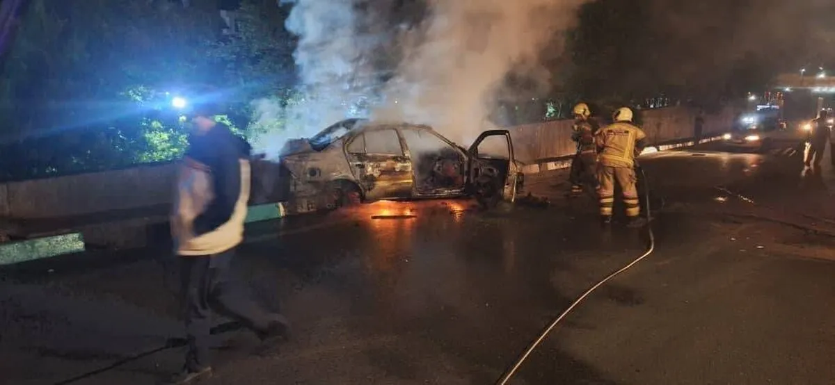 آتشسوزی خودرو سمند بر اثر تصادف در بزرگراه همت