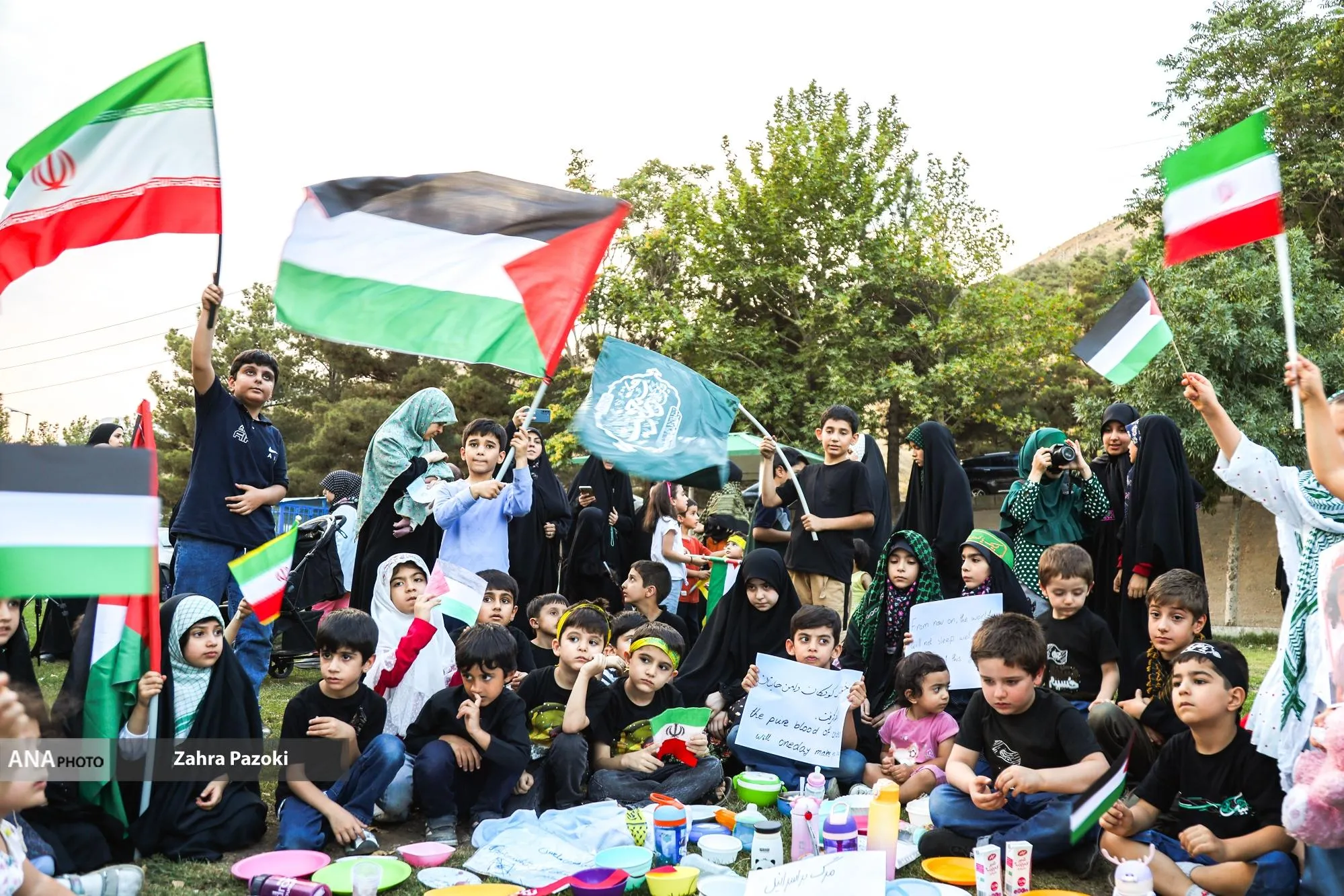 جمعی از مادران با ظرف های کوچک غذای کودکانشان برای نجات غزه با عنوان (ایستاده برای نجات غزه) در زمین چمن ارتفاعات شهرک شهید محلاتی تجمع خودجوش برپا کردند.