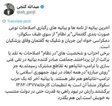 عبدالله گنجی: بیانیه را همسو با ترامپ و نتانیاهو و بازگشت به سیاستهای ناکام سالهای ۱۳۷۷–۱۳۸۲ توصیف کرد.