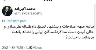 محمد اکبرزاده: پیشنهاد تعلیق غنیسازی را «بلاهت یا خیانت» دانست.