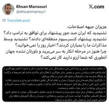 احسان منصوری: بیانیه را انکار واقعیات و نخواندن اخبار روز دانست و تاکید کرد تجربه ایران در مذاکرات و بمبارانها نادیده گرفته شده است.