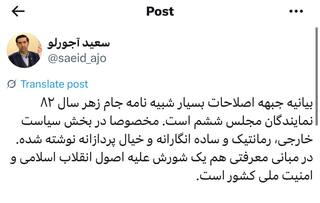 سعید آجورلو: مشابهت بیانیه با «نامه جام زهر سال ۸۲» و رمانتیک و خیالپردازانه بودن سیاست خارجی را نقد کرد و آن را شورش علیه اصول انقلاب و امنیت ملی خواند.